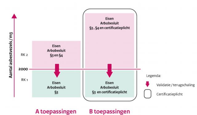 De verplichting tot het hebben van een certificaat voor werken met asbest zal niet langer afhankelijk zijn van de risicoklasse waarin gewerkt wordt, maar van de soort asbesttoepassing die wordt verwijderd. Zo worden de asbesttoepassingen en de inherente risico’s die bij de betreffende toepassing horen leidend voor de verplichting tot certificatie. Om dit te kunnen doen is het nodig om te bepalen wanneer specifieke deskundigheid, en dus certificatie, benodigd is en wanneer niet. De certificatieplicht moet altijd gaan gelden voor die asbesttoepassingen die potentieel tot hoge blootstelling aan asbestvezels kunnen leiden. Dit doet recht aan het uitgangspunt dat de gezondheid en de veiligheid van werknemers voorop staat.