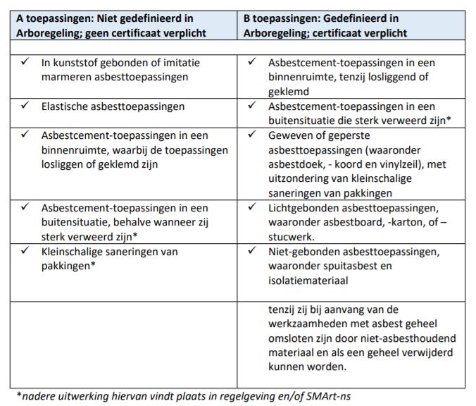 Grofweg maak ik hierbij onderscheid in een tweetal hoofdgroepen die verschillen in de mate van hechtgebondenheid van de asbestvezels. De niet- of lichtgebonden en geweven/geperste asbesttoepassingen kennen over het algemeen hogere concentraties asbest en hierbij kunnen hoge vezelaantallen vrijkomen. Bij verwijdering hiervan is het aantonen van deskundigheid door middel van certificering een vereiste. Een lijst met specifieke toepassingen wordt in de Arboregeling opgenomen en nader geduid (zie de tabel hierna voor meer details).