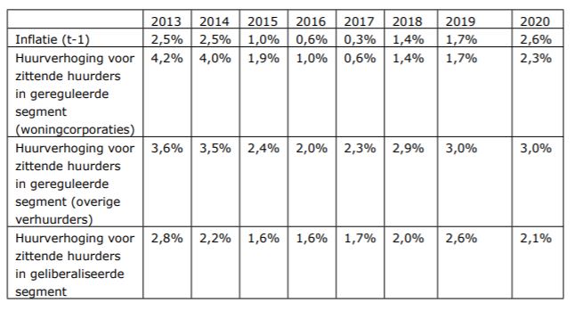 Tabel 1: Gemiddelde (nominale) huurontwikkeling voor zittende huurders in de gereguleerde en geliberaliseerde huursector 2013-2020 (Staten van de Woningmarkt 2013-2019; voorlopige resultaten CBS huurenquête 2020)