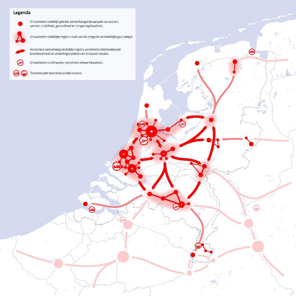 Het Rijk kiest ervoor meer te sturen op ontwikkeling van het hele Stedelijk Netwerk Nederland, gekoppeld aan infrastructuur en goede omgevingskwaliteit. Op de volgende pagina is een kaartbeeld opgenomen van de samenhang in het stedelijk netwerk. In de definitieve NOVI wordt dit beeld opgenomen in een kaart van de integrale Nationale Ruimtelijke Hoofdstructuur, die betrekking heeft op de volle breedte van de NOVI.