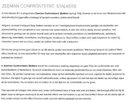 (…) Hierbij verklaar ik (…) dat er tijdens de uitvoering van mijn werkzaamheden voor het Tv-programma ‘Zeeman confronteert: stalkers” door onze redactie en het onderzoeksteam de volgende stalking-handelingen zijn geverifieerd, vastgesteld en/of geconstateerd inzake de stalker [eiser] met betrekking tot het slachtoffer (…)