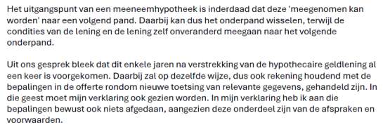 4.6.De verklaring die [naam 3] aan [eiser] heeft gegeven is niet voldoende om te concluderen dat zijn uitleg van de overeenkomst de juiste is. In die verklaring staat niet dat partijen afwijkende afspraken zijn overeenkomen. Wel staat in de verklaring dat het een meeneemhypotheek betreft, maar dat betwist Rabobank op zichzelf ook niet. Zoals gezegd moet [eiser] volgens Rabobank bij de aanvraag van een financiering voldoen aan de op dat moment geldende voorwaarden. In een latere verklaring van [naam 3] aan Rabobank heeft hij verklaard aan die voorwaarde niet te hebben willen afdoen, omdat die onderdeel is van de gemaakte afspraken.