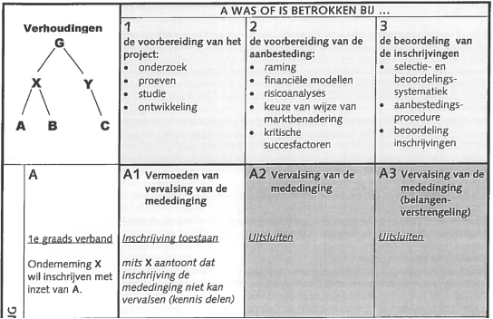 3.6.De in paragraaf 2.12 van de Aanbestedingsleidraad bedoelde nota ‘Scheiding van belang’ is door RWS vastgesteld op 14 september 2007 en bevat richtlijnen en maatregelen voor het tegengaan van belangenverstrengeling bij aanbestedingen. In deze nota is de navolgende matrix opgenomen betreffende negen situaties van mogelijke vervalsing van de mededinging met daarbij een instructie over hoe in die situaties te handelen: