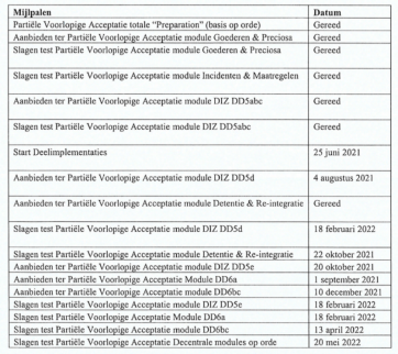 2.10.Op 15 april 2017 hebben DJI en Unisys het Wijzigingsverzoek en het herstelplan BJV ondertekend, waarin staat dat de datum voor oplevering van de Voorlopige Acceptatie wordt gewijzigd in 31 juli 2018 en de datum voor Definitieve Acceptatie wordt gewijzigd in 31 december 2018 en dat deze data als mijlpalen/ fatale termijn conform artikel 27.2 van de Overeenkomst gelden.