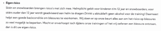 4.9.De enkele mededeling van [verweerders] in haar algemene voorwaarden dat skiërs ouder dan 12 jaar wordt geadviseerd om een helm te dragen en dat een helmplicht geldt voor kinderen jonger dan 12 jaar, is naar het oordeel van de rechtbank een onvoldoende veiligheidsmaatregel. Temeer omdat [verweerders] tijdens de mondelinge behandeling heeft verklaard dat er voorafgaand aan het ongeval helemaal geen helmen werden gedragen bij [verweerders] , ook niet door kinderen jonger dan 12 jaar voor wie wel een helmplicht gold. In de praktijk van de skilessen was er dus geen enkele vorm van actief toezicht op de plicht en het advies tot het dragen van een helm als gevolg waarvan niemand in de hal een helm droeg. Het kennelijk in de skihal aanwezige bord kan onmogelijk als een in dit kader relevante veiligheidsmaatregel beschouwd worden, omdat de tekst daarvan de cursisten er slechts op wijst dat zij de skibaan op eigen risico betreden.