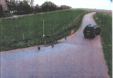 Blz. 6, Foto 2 (…) genomen kort na het ongeval (...) gele pijl op de foto markeert de fiets) en de ongevalssporen door ons gemarkeerd met de spoornummer 0 t/m 5