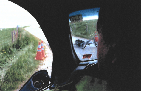 Blz. 17, Foto 23 (…) genomen vanaf (…) de rijrichting van de betrokken fiets. De betrokken Jeep is teruggereden zonder de stand van het stuur te veranderen zoals deze door ons was aangetroffen in de eindpositie. Rond deze positie zal de botsing met de fietser hebben plaatsgevonden. Uit deze reconstructie blijkt dat de betrokken Jeep bijna geheel links van de rijbaan heeft gereden in de bocht naar links.