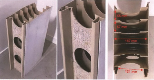 In elke kunststofplank wordt verticale en horizontale ijzeren wapening aangebracht. De horizontale wapening wordt aangebracht door de ronde gaten van de lamellen; deze gaten zijn zichtbaar op de foto’s op de vorige bladzijde. Nadat de kunststofplanken zijn bevestigd op de vloer, worden ze van bovenaf met vloeibaar beton gevuld. Nadat het beton is uitgehard, ontstaat een betonwand die is voorzien van een kunststoflaag van aan elkaar geklikte PVC-platen; dit PVC is zichtbaar op de eerste foto op de vorige bladzijde.
