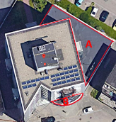Het dak van de Tandartspraktijk bestaat uit twee delen: een groot dakdeel aan de zij- en achtergevel (dakvlak A) en een kleiner halfrond dakdeel boven de ingang (dakvlak B). Zowel op dakvlak A als op dakvlak B rusten balkons van leden van VvE [naam VvE01] .