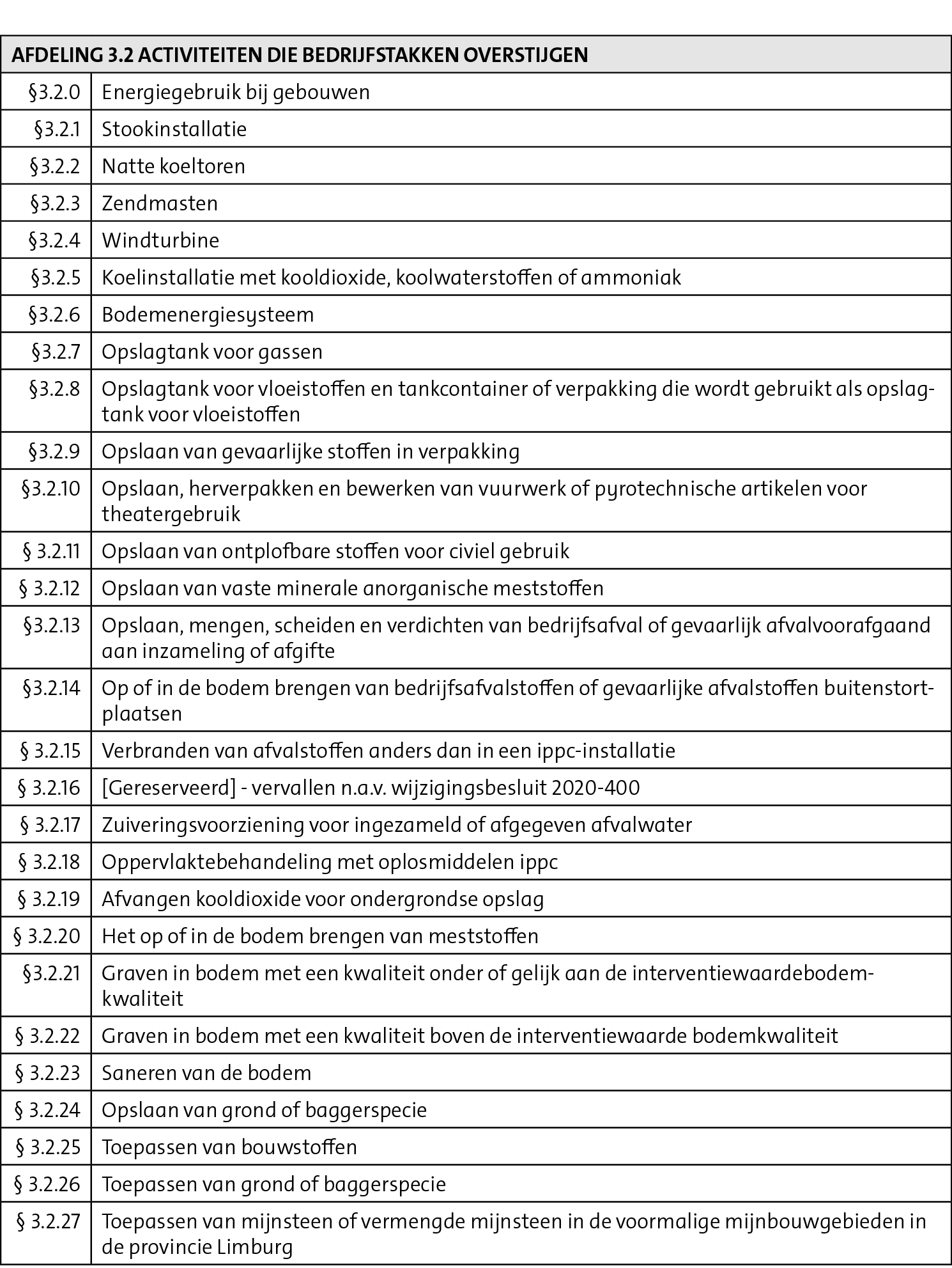 Er zijn in afdeling 3.2 (“Activiteiten die bedrijfstakken overstijgen”) activiteiten opgenomen die vanwege handelingen met afvalstoffen als een mba worden aangemerkt. In onderstaand overzicht zijn alle activiteiten uit afdeling 3.2 vermeld.