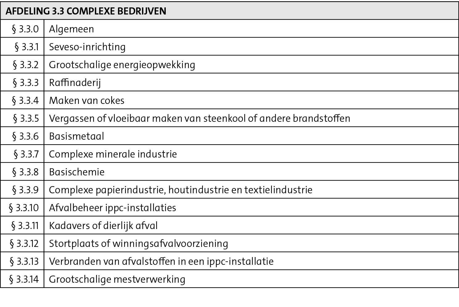 In Afdeling 3.3 zijn de complexe bedrijven opgenomen. De Omgevingswet gebruikt de term complexe bedrijven voor bedrijven die door aard en omvang grote gevolgen kunnen hebben voor de leefomgeving. Bijvoorbeeld omdat de activiteiten van het bedrijf ernstig nadelig zijn voor het milieu. Bij complexe bedrijven is er sprake van vergunningplicht. Voor afvalstoffenbeheer zijn de laatste vijf categorieën van complexe bedrijven van belang.