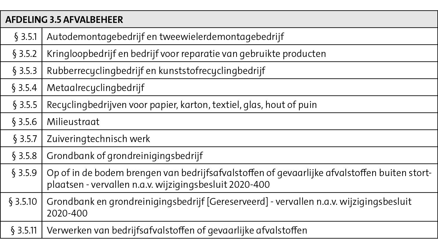 Voor afvalstoffen zijn met name de paragrafen 3.2.13 (opslaan, mengen, scheiden en verdichten van bedrijfsafval en gevaarlijk afval), 3.2.14 (op de bodem brengen van bedrijfsafval en gevaarlijk afval buiten een stortplaats) en 3.2.15 (verbranden van afvalstoffen anders dan in een IPCC-installatie) relevant. De categorieën 3.2.24 – 3.2.27 hebben betrekking op handelingen met de afvalstromen grond, baggerspecie en bouwstoffen.