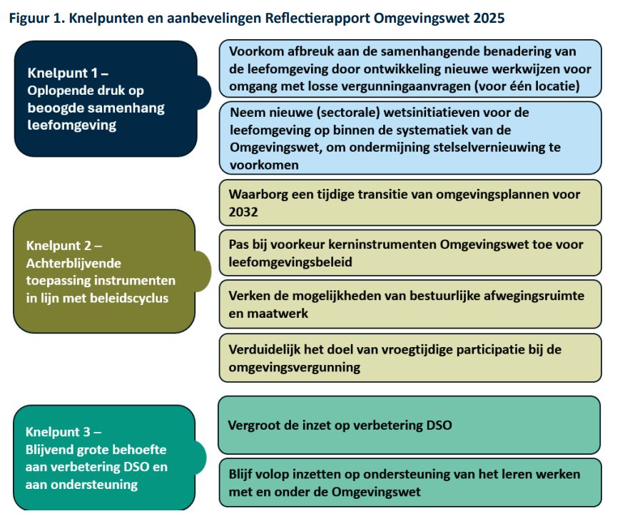 “Wij willen dan ook een oproep doen aan een ieder die met leefomgevingsbeleid werkt om bij voorkeur de kerninstrumenten uit de Omgevingswet toe te passen met een overeenkomstige naamgeving, tenzij deze instrumenten aantoonbaar niet voldoen. De minister van VRO zou daarbij als stelselverantwoordelijke voor de Omgevingswet het goede voorbeeld moeten geven, door de Ontwerp Nota Ruimte ‘omgevingsvisie’ in de titel mee te geven. Dat geeft uitdrukking aan het feit dat de visie verder gaat dan alleen ruimte, en de bredere fysieke leefomgeving betreft.”