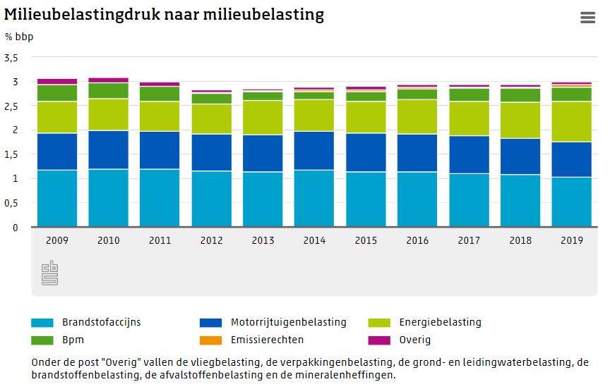 Tussen 2009 en 2012 daalde de milieubelastingdruk met ruim 0,2 procentpunt, daarna krabbelde deze weer wat op. De lastendruk van de wettelijke premies en de niet-milieubelastingen was in 2019 hoger dan in 2009, onder meer door de verhoging van btw-tarieven, hogere opbrengsten uit de vennootschapsbelasting en de inkomstenbelasting, de invoering van de verhuurderheffing en de verhoging van de assurantiebelasting.
