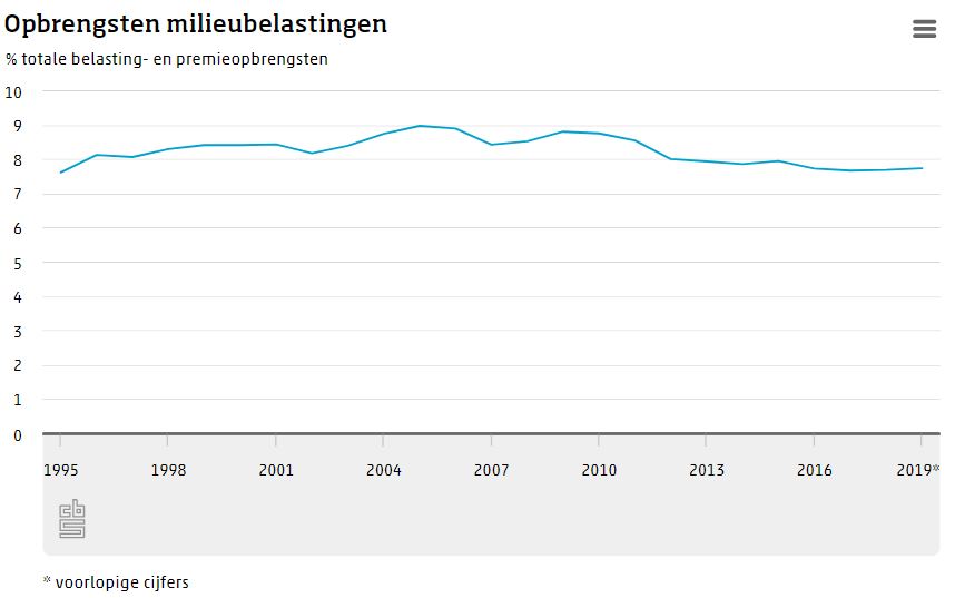 Milieubelastingen vormen kleiner deel belastingopbrengsten. In 2019 bedroegen de opbrengsten uit milieubelastingen 24,4 miljard euro. Hiermee maakten milieubelastingen 7,7 procent uit van de totale belasting- en premieopbrengsten van de Nederlandse overheid. Tien jaar eerder was dit aandeel 8,8 procent. In de tweede helft van de jaren negentig en het begin van de 21e eeuw steeg dit aandeel nog gestaag. Het principe “De vervuiler betaalt” gaat in Nederland lang niet altijd op. Dit meldt het CBS in het artikel “Aandeel milieubelastingen kleiner dan tien jaar geleden”.