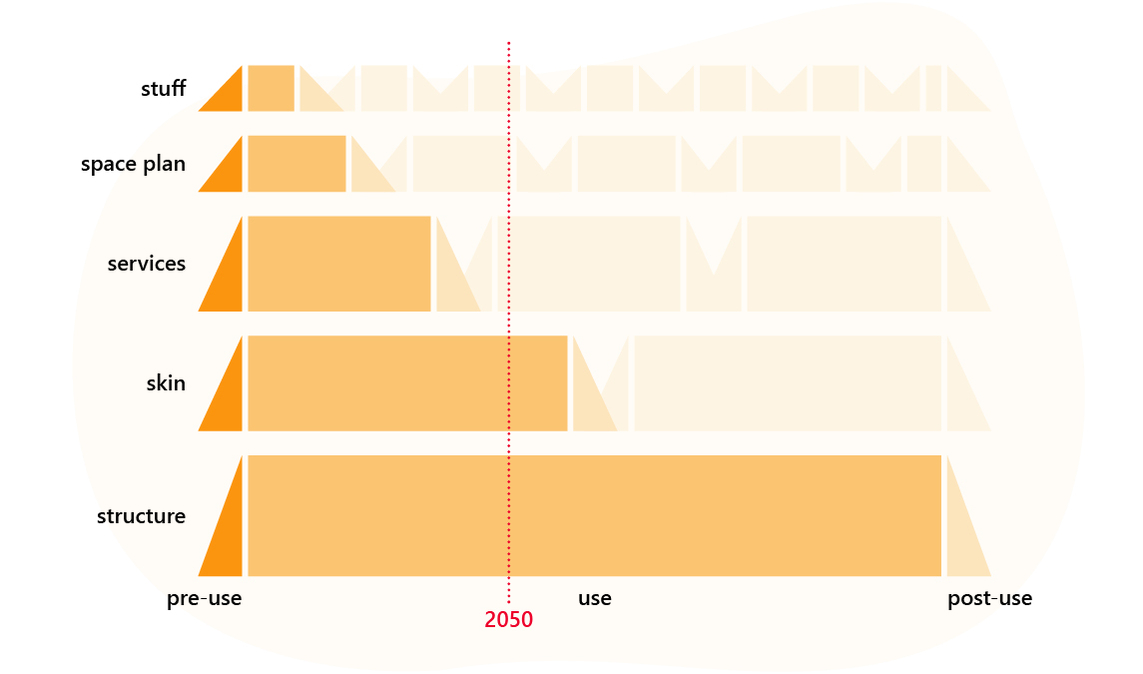 Vanuit 2050 beredeneerd kunnen we ons als eerste afvragen voor welke laag we geen tweeede kans meer krijgen om het goed te doen. Een constructie staat er in 2050 nog, terwijl je voor het meubilair nog een tweede, derde en wellicht zelfs nog een vierde kans krijgt om het zonder of met positieve impact te doen (zie onderstaand figuur). Elke laag heeft dus een eigen levensduur met zijn eigen belasting op de beschikbare grondstoffen. Door bewust keuzes te maken in de lagen waar de meeste winst op lange termijn te behalen is, kan binnen de projectkaders een positief resultaat voor de grondstoffenvoorraad behaald worden.