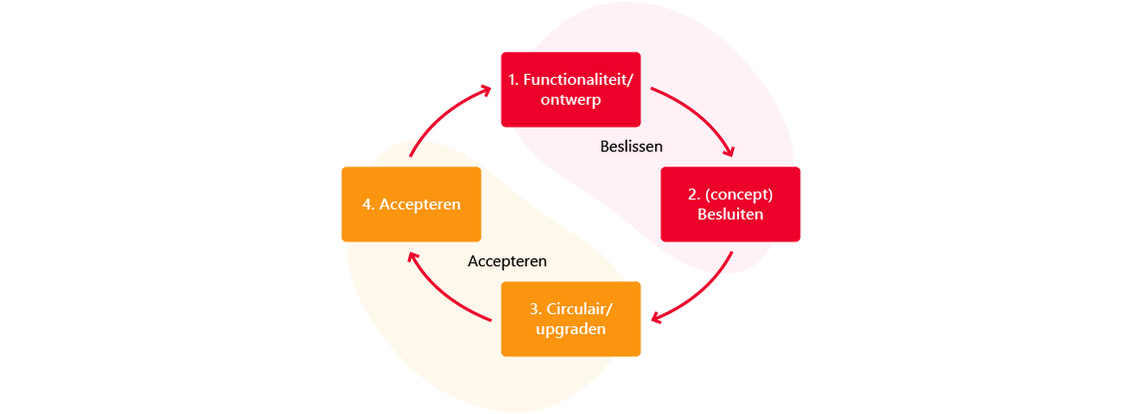 Maar de meeste invloed zit bij de faseresultaten als de opdrachtgever kán en moet beslissen. Om maximaal ruimte te bieden aan het ‘circulair upgraden’ van het project wordt eerst in concept besloten of de geboden functionaliteit of ontwerp voldoende is. Daarna wordt gekeken of er op basis van beschikbaar aanbod een match te maken is. Het is aan de opdrachtgever om de kaders van dit tussentijdse onderzoek vast te stellen. Hoeveel tijd mag dit kosten? En is een alternatieve functionele oplossing ook acceptabel? De resultaten van deze meer circulaire variant wordt vervolgens door de opdrachtgever vastgesteld als uitgangspunt voor de volgende fase. Een volgende fase waarin dit proces zich herhaalt, maar op de onderwerpen die daarin relevant zijn.