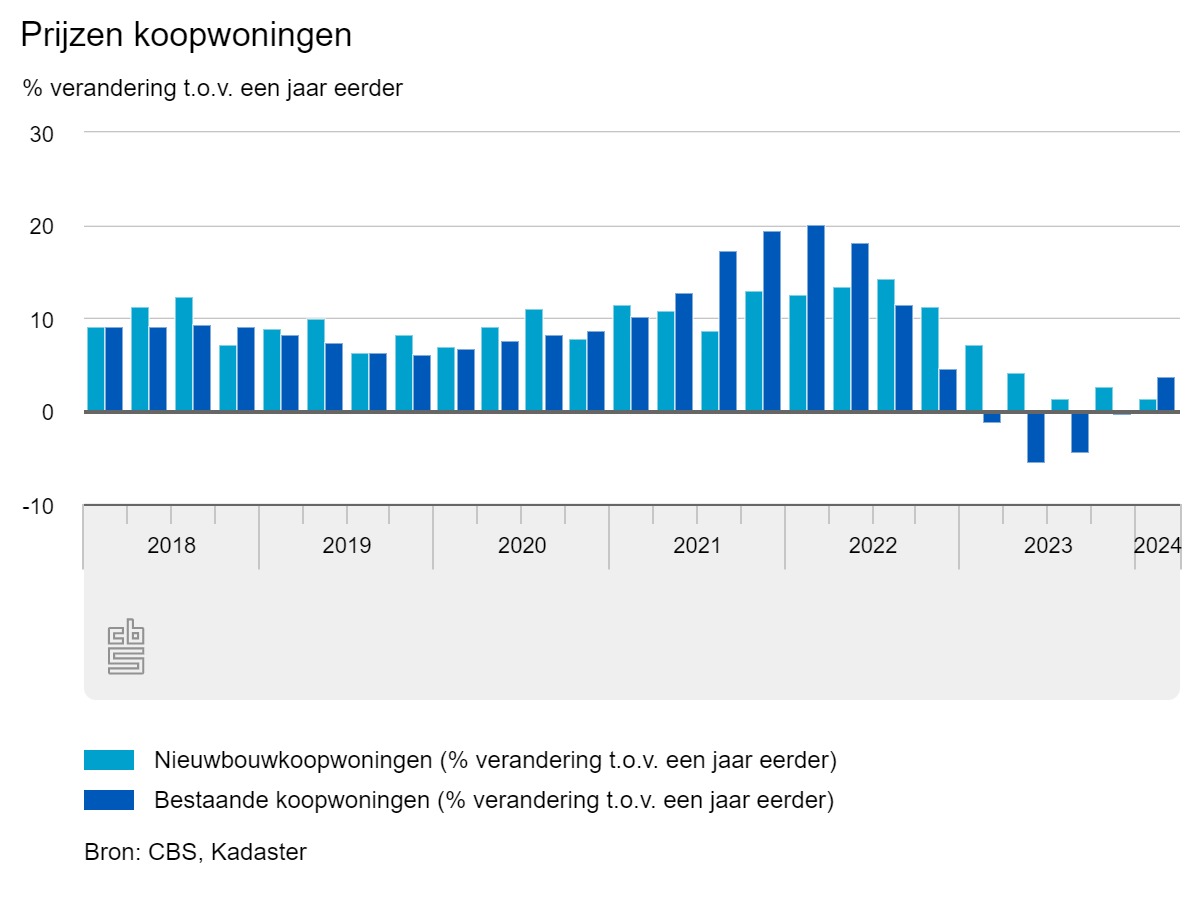 In het eerste kwartaal van 2024 werden er ruim 4,4 duizend nieuwbouw koopwoningen verkocht, 34 procent meer dan een jaar eerder. De prijsindex van nieuwbouw koopwoningen was 1,4 procent hoger dan een jaar eerder. De prijsindex voor de bestaande koopwoningen steeg met 3,8 procent, de eerste stijging sinds het vierde kwartaal 2022. De huizenprijsindex, opgebouwd uit nieuwbouw en bestaande koopwoningen, stijgt 3,6 procent. Dit blijkt uit nieuwe cijfers van het CBS, het Kadaster en Eurostat.