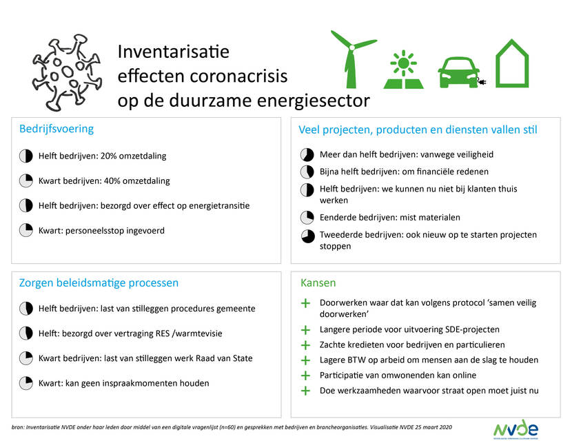 Net als in veel andere sectoren ondervinden ook bedrijven in duurzame energie de consequenties van de coronacrisis. Twee op de drie NVDE-leden die antwoordden op de inventarisatie hebben al projecten moeten stilleggen. De helft verwacht op korte termijn een omzetdaling van twintig procent of meer; een kwart verwacht een omzetdaling van veertig procent of meer. Bijna de helft van de respondenten merkt ook dat overheidsprocessen zoals vergunningsprocedures worden stilgelegd. Ruim de helft voorziet ook grote problemen bij het uitvoeren van participatieprocessen met omwonenden, bijvoorbeeld bij wind- en zonprojecten.