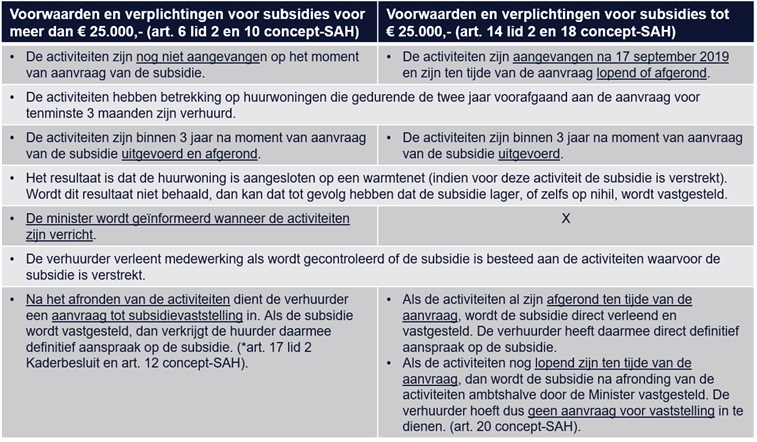 In de vorige update kwam de Stimuleringsregeling Aardgasvrije Huurwoningen al aan de orde. Op 14 december 2019 is de internetconsultatie van de SAH gepubliceerd. Deze regeling is bedoeld om de kosten te verlagen voor verhuurders voor het aardgasvrij maken van bestaande huurwoningen in Nederland. Van 1 april t/m 31 december 2020 kunnen verhuurders een subsidieaanvraag indienen voor het aansluiten van huurwoningen op warmtenetten, en het aardgasvrij maken van huurwoningen die al zijn aangesloten op een warmtenet. Hierbij geldt de volgorde van binnenkomst. Het is dus van belang om op tijd/direct een complete & goede aanvraag in te dienen, anders bestaat de kans dat je achter het net vist. Een van de vereisten is het overleggen van een overeenkomst met een warmtebedrijf. Als aansluiting van de huurwoningen op het warmtenet alleen betaalbaar en realiseerbaar is als subsidie wordt verleend, is het aan te raden om daar in de overeenkomst een voorziening voor op te nemen. Denk hierbij ook alvast na hoe partijen de kosten verdelen als de subsidie uiteindelijk lager wordt vastgesteld (bijvoorbeeld doordat aansluiting langer dan 3 jaar duurt). Schematisch ziet de regeling er als volgt uit: