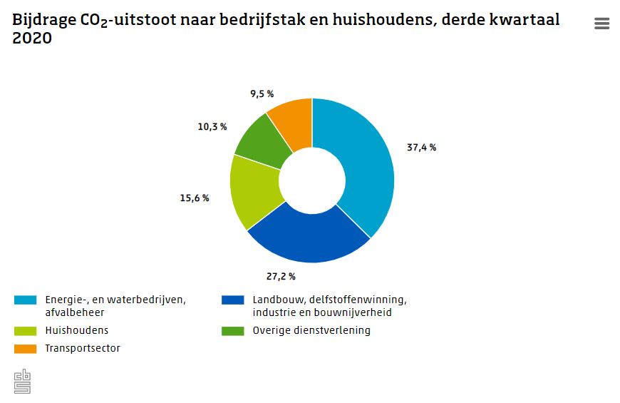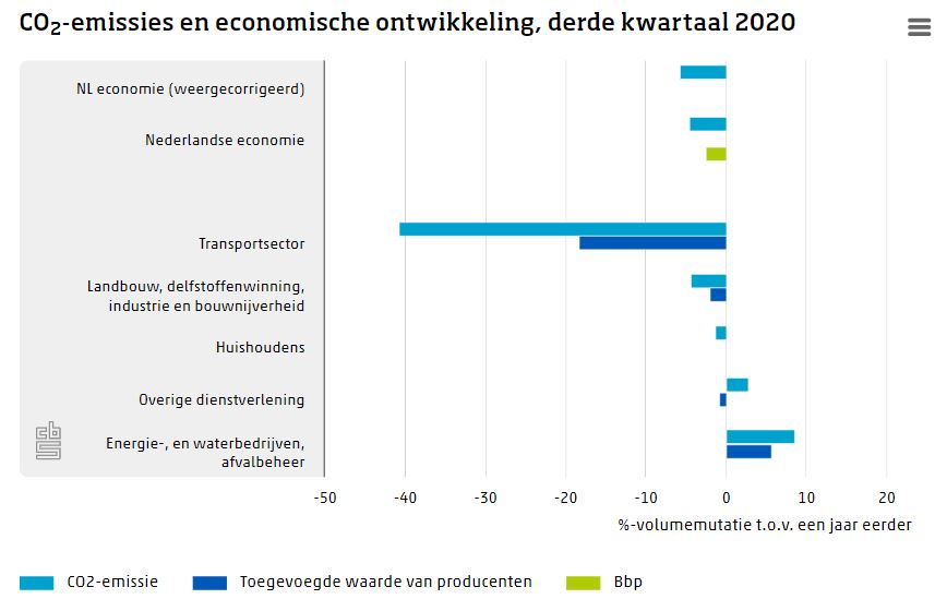De CO2-uitstoot door Nederlandse economische activiteiten was in het derde kwartaal 4,5 procent lager dan in hetzelfde kwartaal van 2019. Volgens de eerste berekening kromp het bruto binnenlands product (bbp) in dezelfde periode met 2,5 procent. Ook in de eerste twee kwartalen van 2020 lagen de emissies lager dan een jaar eerder. De impact van de coronacrisis op de CO2-uitstoot is ook in het derde kwartaal duidelijk zichtbaar. Zo was de CO2-uitstoot van de transportsector ruim 40 procent lager dan een jaar eerder. De elektriciteitsbedrijven hebben echter, door een hogere elektriciteitsproductie, bijna 9 procent meer uitgestoten. Dit meldt het CBS op basis van de nieuwe kwartaalcijfers over de CO2-uitstoot.