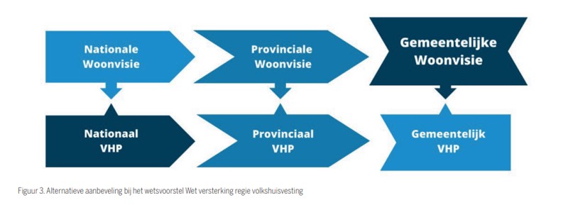 Het volkshuisvestingsprogramma wordt verplicht op drie bestuursniveaus (gemeente, provincie en minister). Ook dit kan voort verwarring zorgen, nu die beleidskaders niet wettelijk van Rijk naar provincie en vervolgens gemeenten doorwerken. Afstemmingsproblemen met het vaststellen van de zes beleidskaders (drie omgevingsvisies en drie volkshuisvestingsprogramma’s) zijn te voorzien. De vraag is of het doorwerken van beleidskeuzes van omgevingsvisie naar volkshuisvestingsprogramma en van Rijk naar provincies en vervolgens gemeenten soepel zal verlopen. Wat als dat niet zo is? Zo zou in theorie het gemeentelijke volkshuisvestingprogramma het ultieme kader voor corporaties moeten zijn waarop zij zich met hun plannen moeten baseren. Moeten corporaties controleren of het gemeentelijk programma strook met het rijks- en provinciaal beleid, om zeker te zijn dat hun plannen niet worden ingehaald door ingrijpen achteraf door provincie of minister?