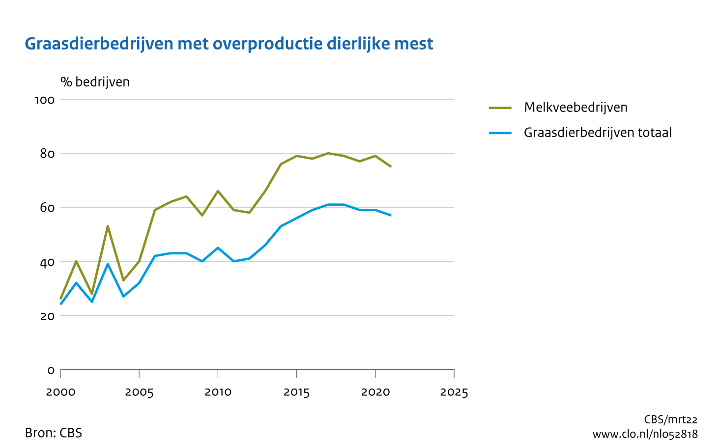 In 2021 produceerden drie van de vier melkveebedrijven meer dierlijke mest dan volgens de gebruiksnormen op eigen grond mag worden aangewend. Van de hokdierbedrijven had zelfs 92 procent een overproductie.