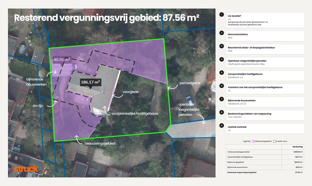 Om het bouwproces te versnellen, gebruikt Struck AI om bouwregelgeving te doorzoeken en advies te geven. De ‘bibliotheek’ van Struck omvat alle landelijke wetten en regels, en lokale regelgeving zoals parkeernormen en welstandsnormen. Daarnaast heeft Struck een directe link naar alle omgevingsplannen en toont het wat de mogelijkheden per adres zijn op basis van het Omgevingsloket.