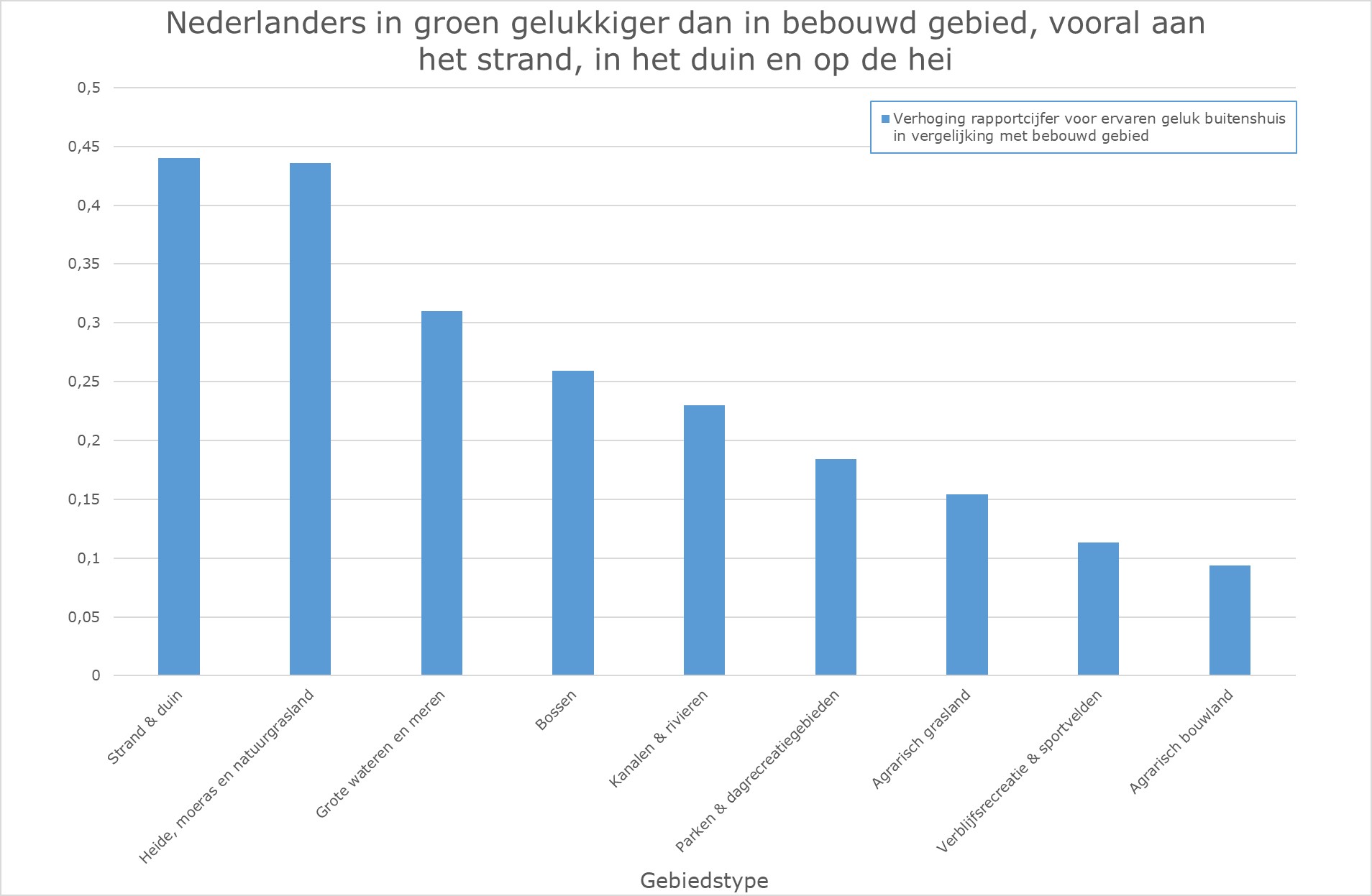 In een grootschalig burgeronderzoek heeft Wageningen Environmental Research op verzoek van het Planbureau voor de Leefomgeving onderzocht of het geluksgevoel verschilt per type gebied waarin men zich bevindt. Deelnemers aan het onderzoek beantwoordden via de app HappyHier gemiddeld 25 keer de vraag hoe gelukkig zij zich op dat moment voelen. Dat gebeurde zowel als ze zich buiten bevonden, als in huis en op het werk. Tegelijkertijd registreerde de app in welk gebiedstype de deelnemers zich op dat moment bevonden. Hierdoor is nu ook voor Nederland bevestigd dat mensen zich in groene gebieden gelukkiger voelen dan in bebouwd gebied. Uit het onderzoek blijkt ook dat er verschillen bestaan tussen het geluksgevoel in de verschillende groene gebiedstypen. Nederlanders voelen zich aan de kust en in gebieden met lage natuurlijke begroeiing, zoals de hei, gelukkiger dan in parken en het agrarische gebied. Dit betekent dat het bevorderen van bezoeken aan meer natuurlijke gebieden buiten de stad een middel is om het mentale welzijn van de bevolking te vergroten.