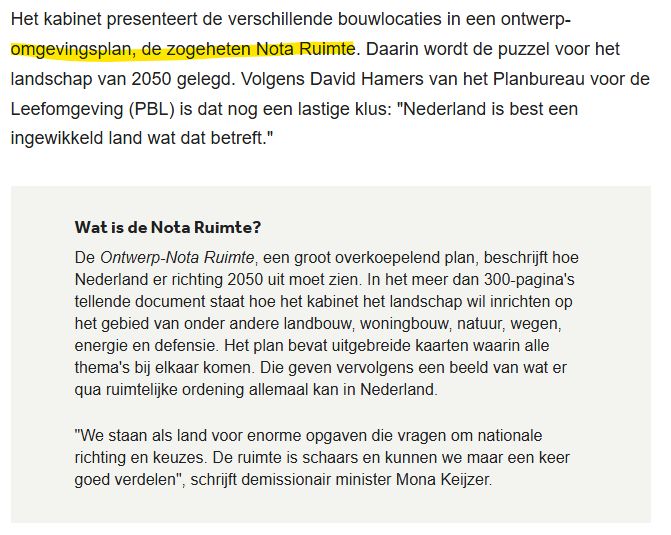 NB: deze snip is van een NOS artikel, en laat mooi zien dat de naam "Nota Ruimte" niet duidelijk is én de beeldvorming van ruimtelijke ordening oproept. Wat nu net niet de bedoeling is: de omgevingsvisie is breder dan ruimtelijke ordening.
