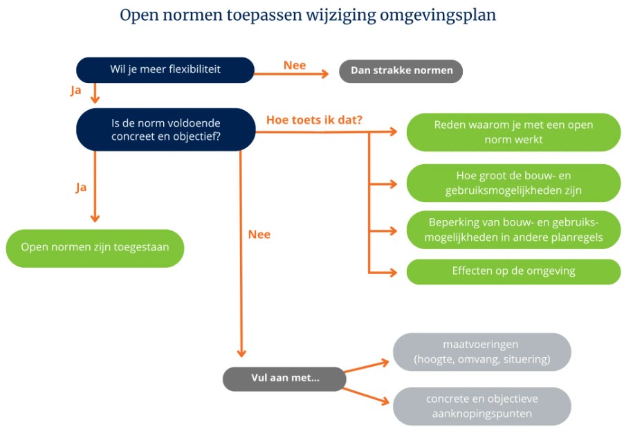 De begrenzing en concretisering kan alleen in de vorm van (1) toegestane maatvoeringen (zoals maximale bouwhoogten) en/of (2) concrete en objectieve aanknopingspunten waar de open norm op ziet (voorbeelden van aspecten waar de open norm over gaat). Daarbij bestaat de vrijheid om één van deze vormen te gebruiken, of beide (1 en 2) te combineren.