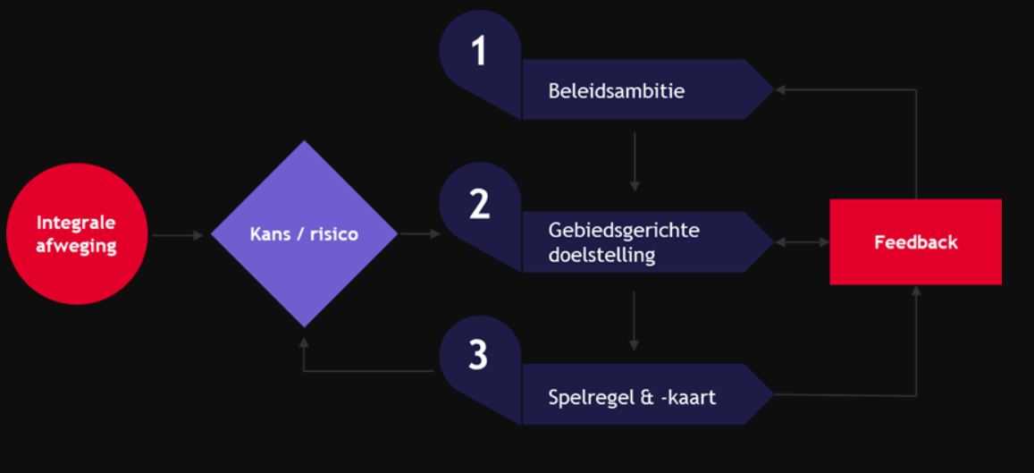 Zoals in de inleiding al werd geschetst, komt er bij het maken van het spel nogal wat kijken. Als spelmaker heb je te maken met ambitie en doelstellingen binnen tal van beleidsthema’s. En daarbij moet je ook nog eens rekening houden met de huidige en toekomstige spelers in het gebied. Het gevaar ligt op de loer dat je door de spreekwoordelijke bomen het bos niet meer ziet. Hoe creëer je uit deze ogenschijnlijke chaos dé spelregels die 1: recht doen aan alle beleidsambities maar die 2: tegelijkertijd niet zo streng en ingewikkeld zijn dat ze het spel belemmeren? Hoe integreer je alle ambities in een haalbaar plan?
