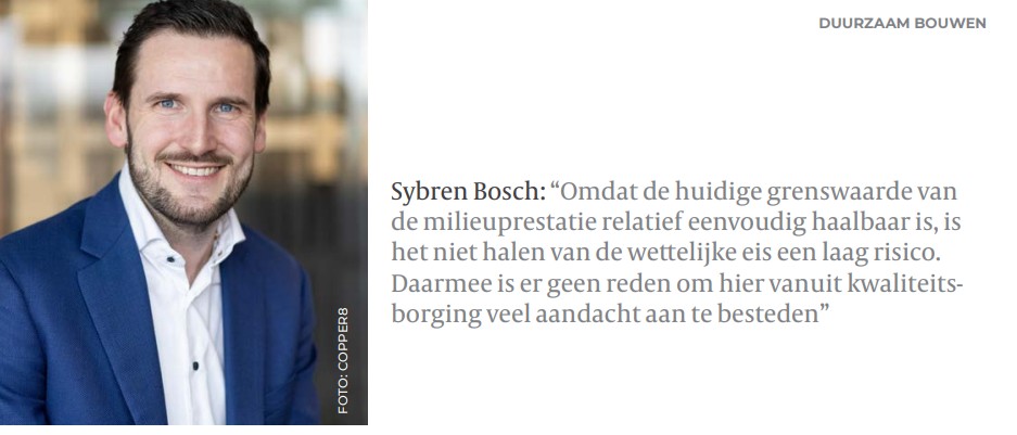 Sybren Bosch van Copper8 en Judith Anjema van ontwikkelende bouwer J.P. van Eesteren gaven tijdens twee online sessies toelichting. “Als we serieus zijn over onze ambities op klimaat en circulaire economie, is een goede toetsing en handhaving van de MPG noodzakelijk. We stellen in steeds meer projecten circulaire ambities, maar weten vaak simpelweg niet wat er in de praktijk wordt gerealiseerd”, aldus Sybren. Hij vervolgt: “De publicatie is het resultaat van gesprekken met betrokkenen bij kwaliteitsborging en circulair bouwen, zoals kwaliteitsborgers, gemeenten, bouwers, adviseurs en rekeninstrumenthouders. Doel van deze verkenning is om de noodzaak van betere kwaliteitsborging van de milieuprestatie te agenderen. Maar we hopen dat de verkenning ook bijdraagt aan verdere professionalisering van de kwaliteitsborging op de milieuprestatie.”