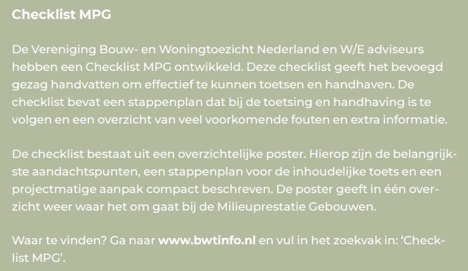 9. Controleren van toegepaste materialen (steekproefsgewijs), om te bepalen of producten uit MPG-berekening ook daadwerkelijk worden toegepast. Bij wijzigingen in materialen of installaties de geactualiseerde MPG-berekening opvragen.