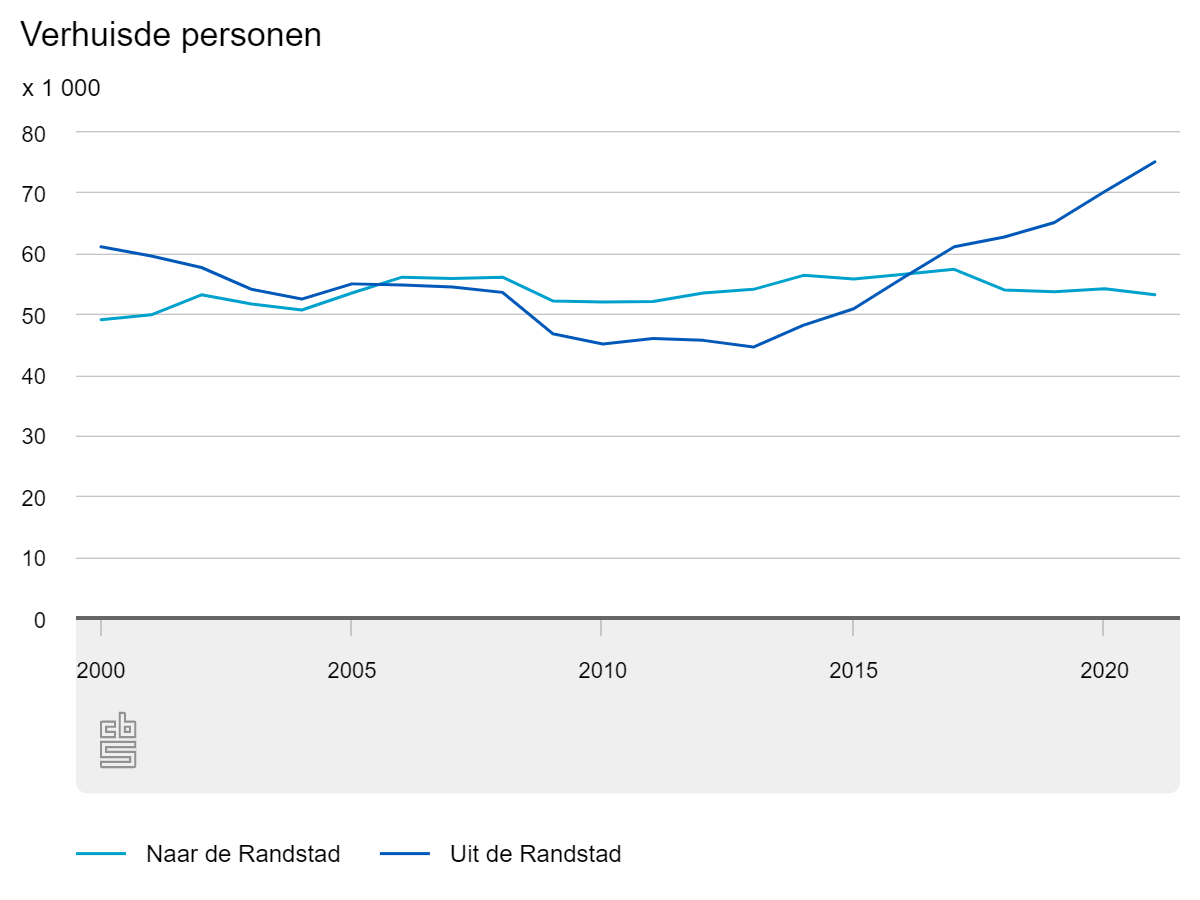 Ruim 75 duizend mensen verlieten de Randstad in 2021 om elders in Nederland te gaan wonen, 5 duizend meer dan een jaar eerder. Het aantal mensen dat naar de Randstad verhuisde nam juist licht af naar 53 duizend. In 2021 verhuisden er dus 22 duizend mensen meer vanuit de Randstad naar gemeenten daarbuiten dan in omgekeerde richting. Deze trek uit de Randstad neemt al vanaf 2014 toe. Vanaf 2017 verhuizen meer mensen uit de Randstad dan erheen. Ook buiten de Randstad zijn de verhuizingen steeds meer gericht op regio’s aan de randen van Nederland.