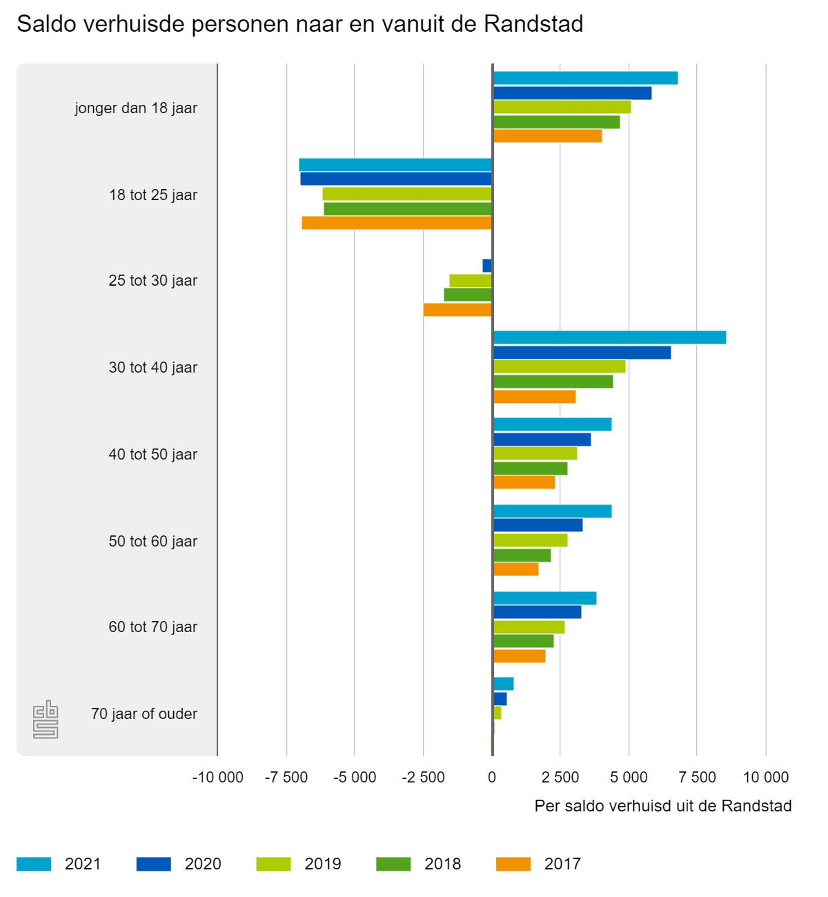Jongvolwassenen van 18 tot 25 jaar verhuizen juist vaker naar de Randstad dan omgekeerd. Zij verhuizen vooral vanwege studie of werk. Het verhuissaldo van deze leeftijdsgroep is de laatste vijf jaar nauwelijks veranderd. Eind-twintigers verhuisden tot enkele jaren terug ook vaker naar dan uit de Randstad, maar in 2021 verhuisden er vrijwel evenveel 25- tot 30-jarigen vanuit de Randstad naar overige regio’s als omgekeerd.