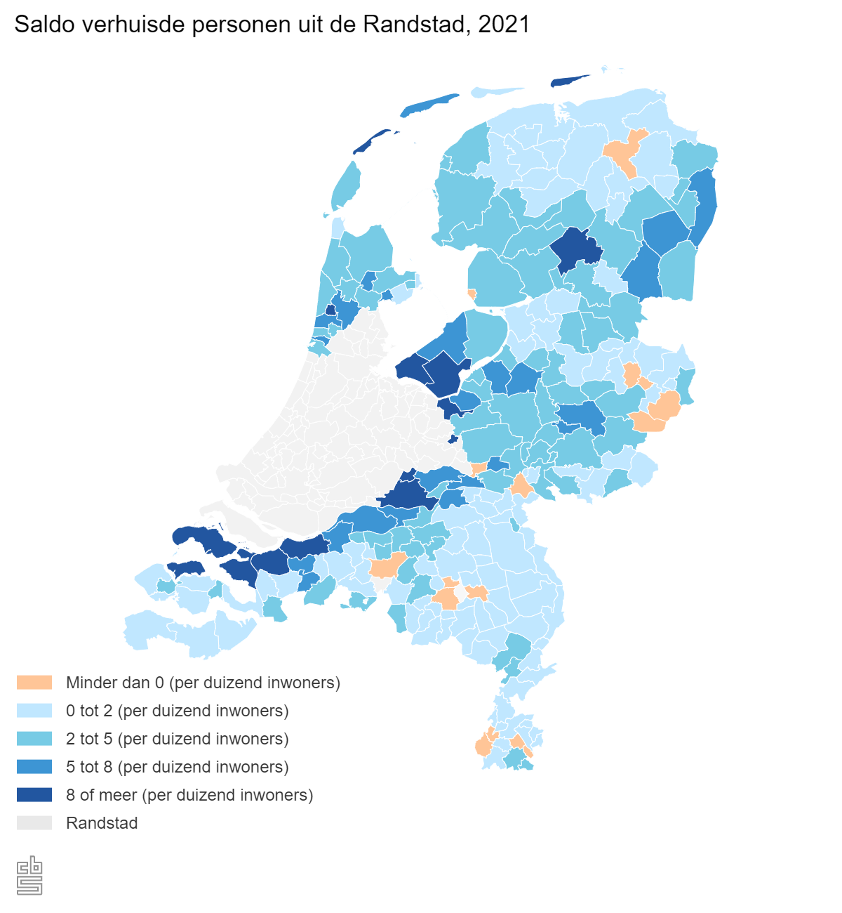 Vrijwel alle gemeenten buiten de Randstad hadden in 2021 een positief verhuissaldo met de Randstad. Dit betekent dat er vanuit de Randstad meer mensen naar die gemeenten zijn gekomen dan andersom. Uitzonderingen zijn onder meer de universiteitssteden Groningen, Maastricht, Eindhoven, Wageningen, Tilburg en Enschede. Uit deze gemeenten vertrekken veel pas afgestudeerden naar de Randstad vanwege werk. Gemeenten die naar verhouding de meeste inwoners uit de Randstad erbij krijgen liggen deels betrekkelijk dicht bij de Randstad, in bijvoorbeeld Flevoland, Schouwen-Duiveland, het Rivierengebied, de Veluwe en het noordelijke deel van Noord-Holland. Maar ook op grotere afstand zijn er gemeenten die relatief veel inwoners uit de Randstad aantrokken in 2021. Die liggen bijvoorbeeld in Drenthe, het zuiden van Friesland, de Achterhoek en Oost-Groningen.
